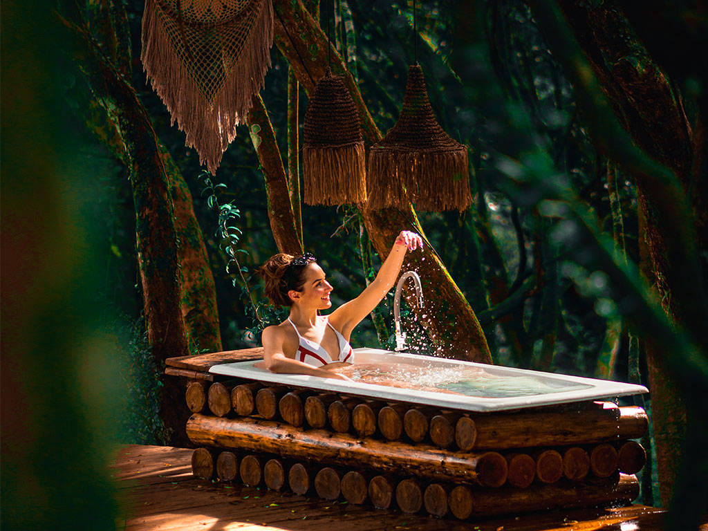 Nossa Esphera Água está inserida na mata nativa. Sua atmosfera conta com tons mais claros, decoração com corda e macramê, e uma banheira individual de imersão privativa com água quente na mata nativa para relaxar em total harmonia com a natureza.