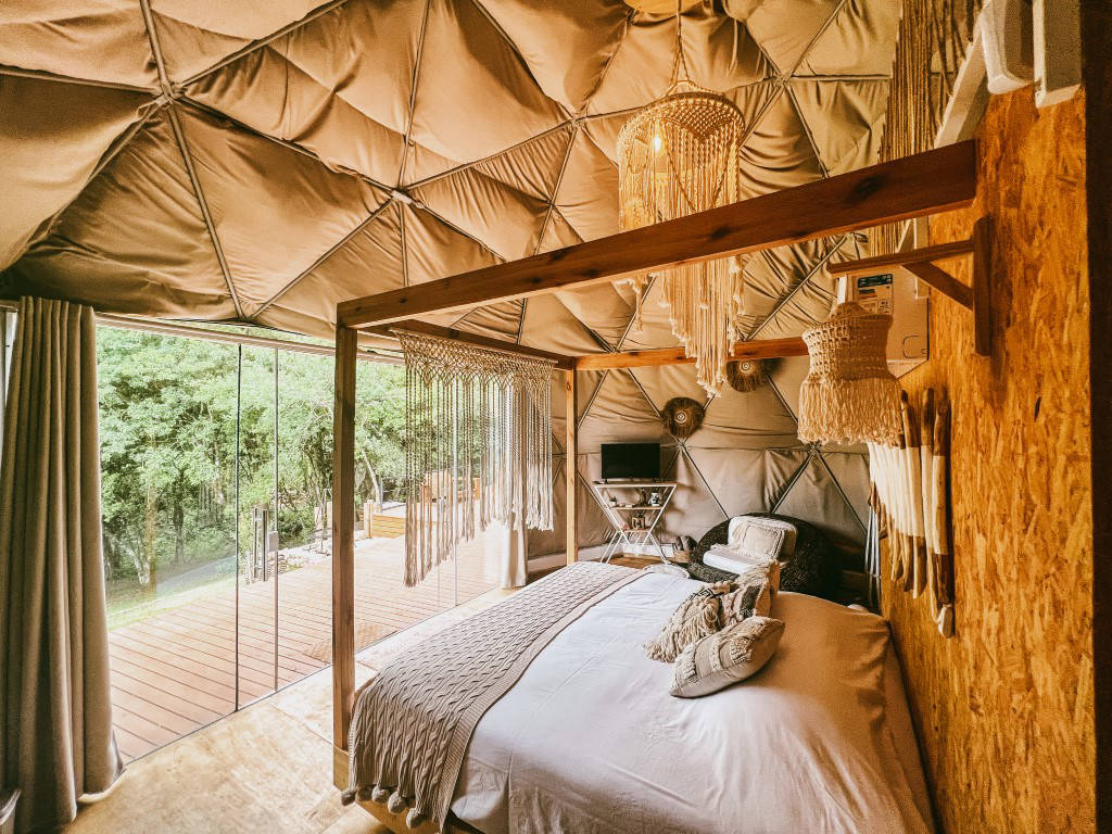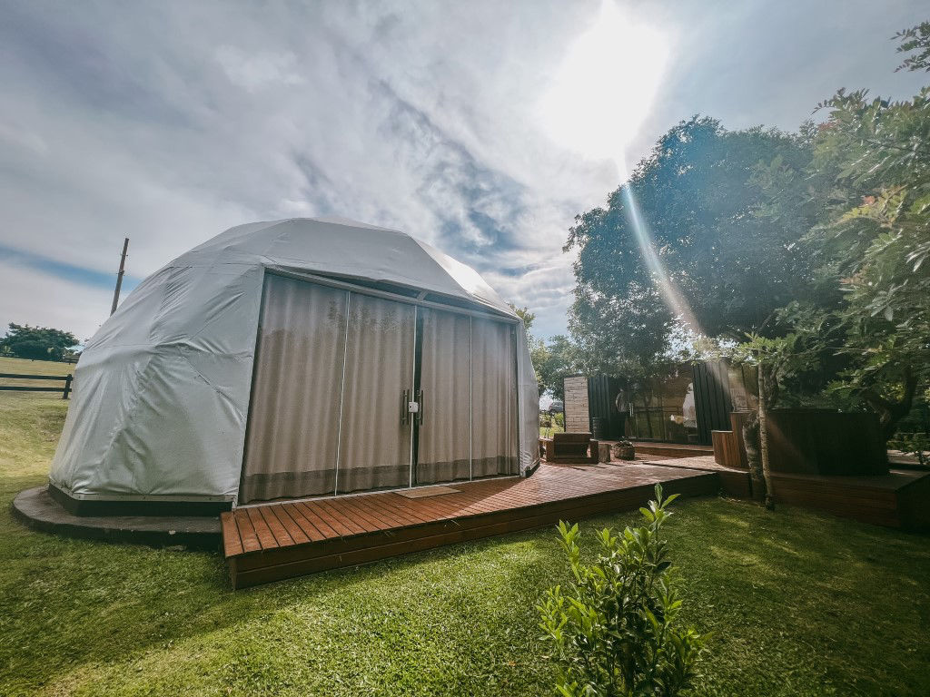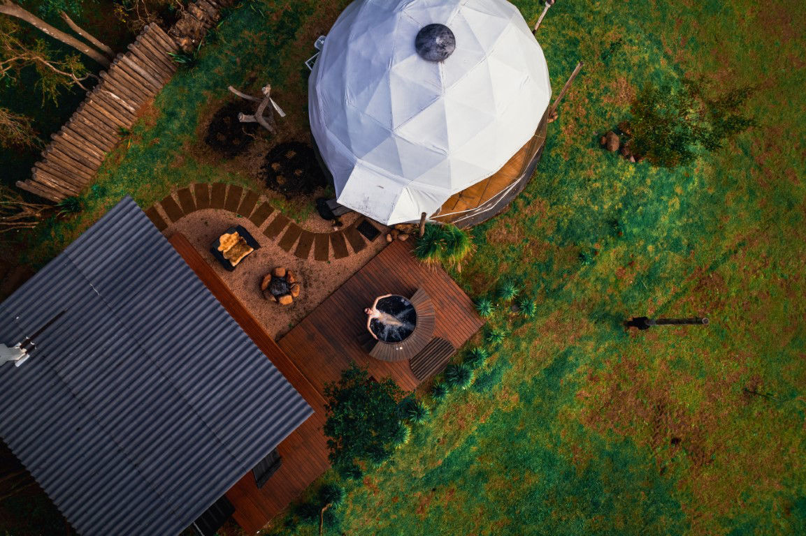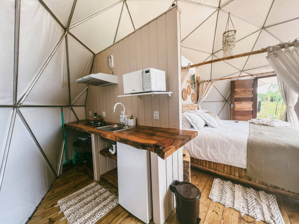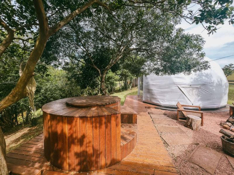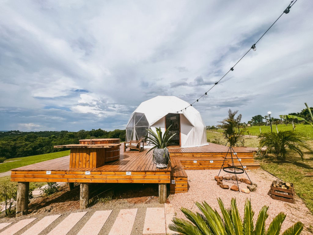 E temos 3 Espheras (Onyx, Tay e Gaya) que acomodam até 2 pessoas. Sendo também um Domos Geodésico (sem mezanino) com banheiro privativo, cozinha integrada e com uma área externa com fogo de chão e trempe.