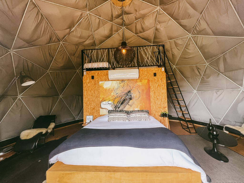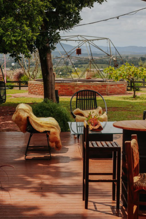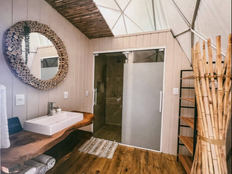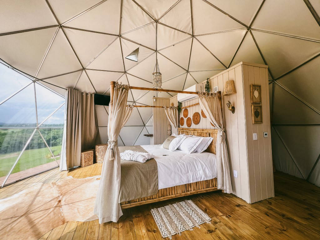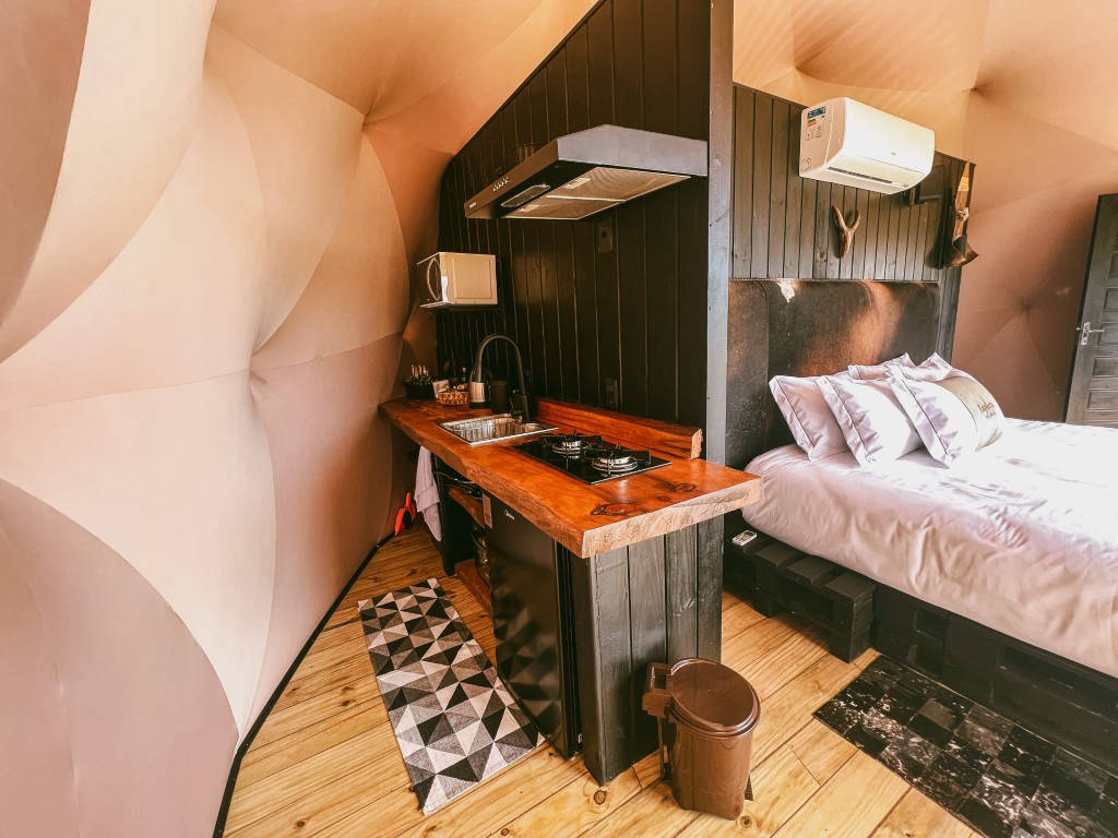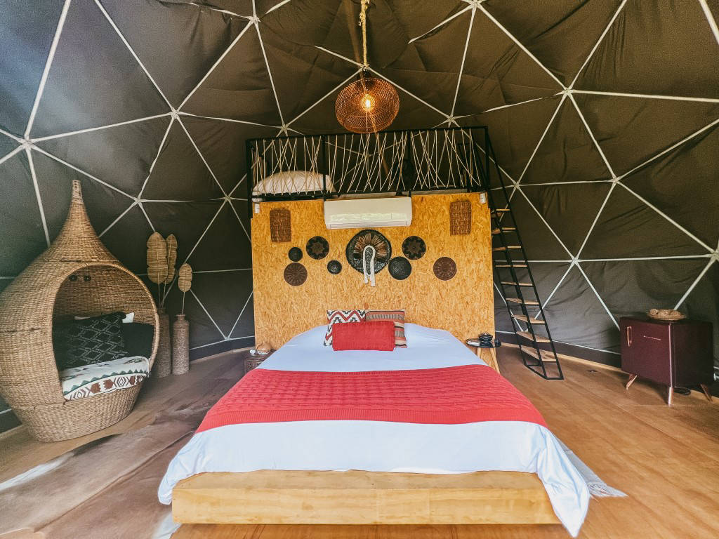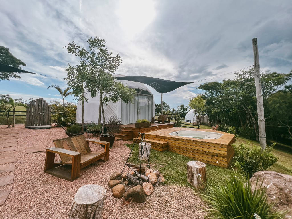 E temos 3 Espheras (Onyx, Tay e Gaya) que acomodam até 2 pessoas. Sendo também um Domos Geodésico (sem mezanino) com banheiro privativo, cozinha integrada e com uma área externa com fogo de chão e trempe.