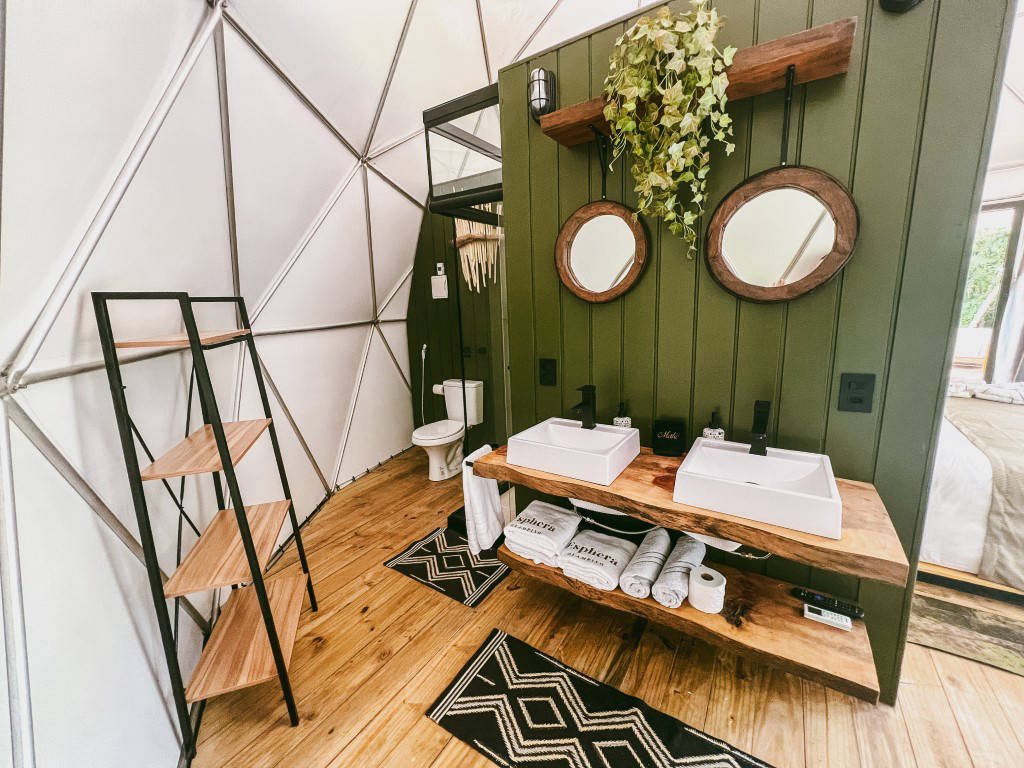 No meio da natureza, e rodeado por infra-estrutura, nossas cabanas tem esse lindo formado esférico! Para viver essa tendência global que é o glamping com muito estilo e personalidade! Esphera, remete ao formato dos nossos Domos Geodésicos e a atmosfera especial que criamos por aqui. Aventura com segurança e fuga da rotina com comodidade. Nas esferas, temos banheiro, chuveiro, frigobar, ar-condicionado, lareira, fogo de chão, ofurô aquecida com cromoterapia e espaço gourmet completo com cozinha e churrasqueira… A gente disse que era o encontro entre glamour e camping, né? Cada cabana garante seu conforto, segurança e bem-estar.