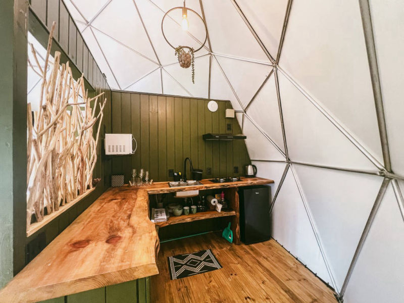 Sua cozinha é integrada, sendo uma espécie de Domos “loft” com 38m2 e muito funcional. Ela possui aquecimento de água á gás, além de ser idealizada com acessibilidade para cadeirantes.