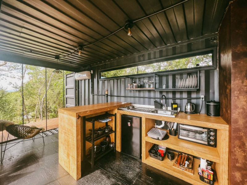 • Container Gourmet climatizado e equipado com cozinha completa (cooktop elétrico/forno elétrico) e todos os utensílios básicos.