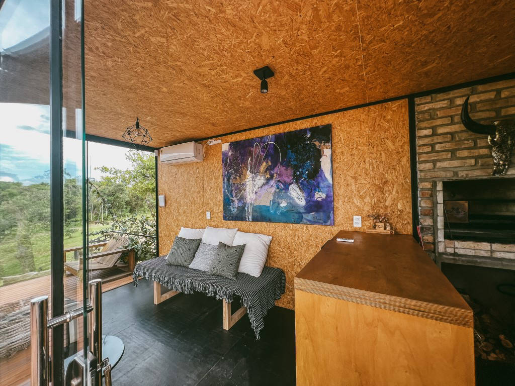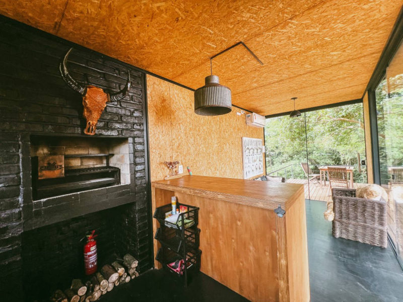 Para os amantes do fogo e do churrasco, conta com um fogo de chão e 2 churrasqueiras, uma trempe com grelha de ferro para fazer uma assado ao ar livre e uma churrasqueira interna no container.